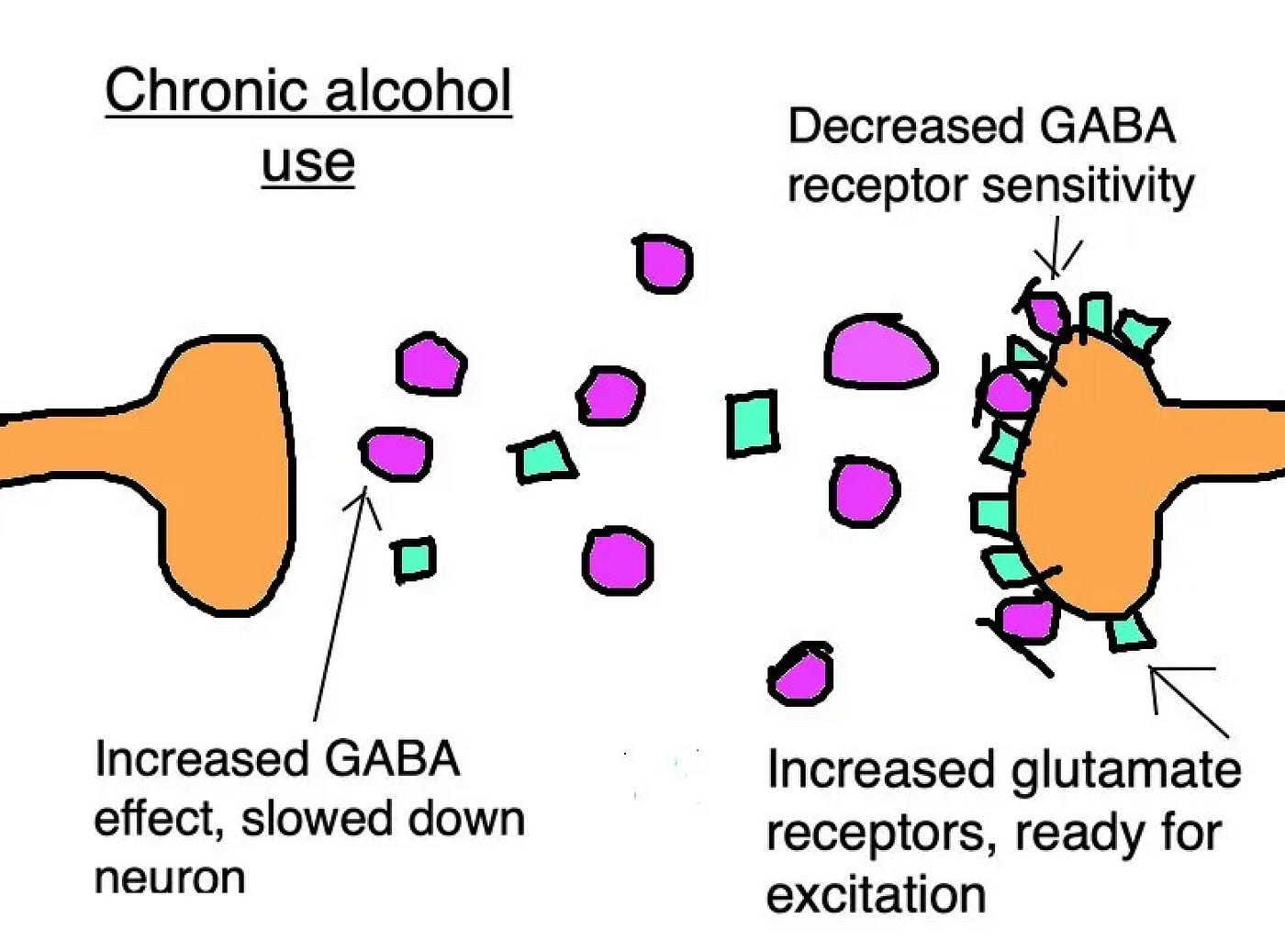 As I said above, alcohol increases the inhibitory effect of GABA on neurons. With increased amounts of alcohol, the nervous system tries to adapt by decreasing the receptor’s sensitivity that receives GABA. The body senses that the nervous system is too slow, so it blocks the GABA coming in, leaving more GABA between the two neurons.